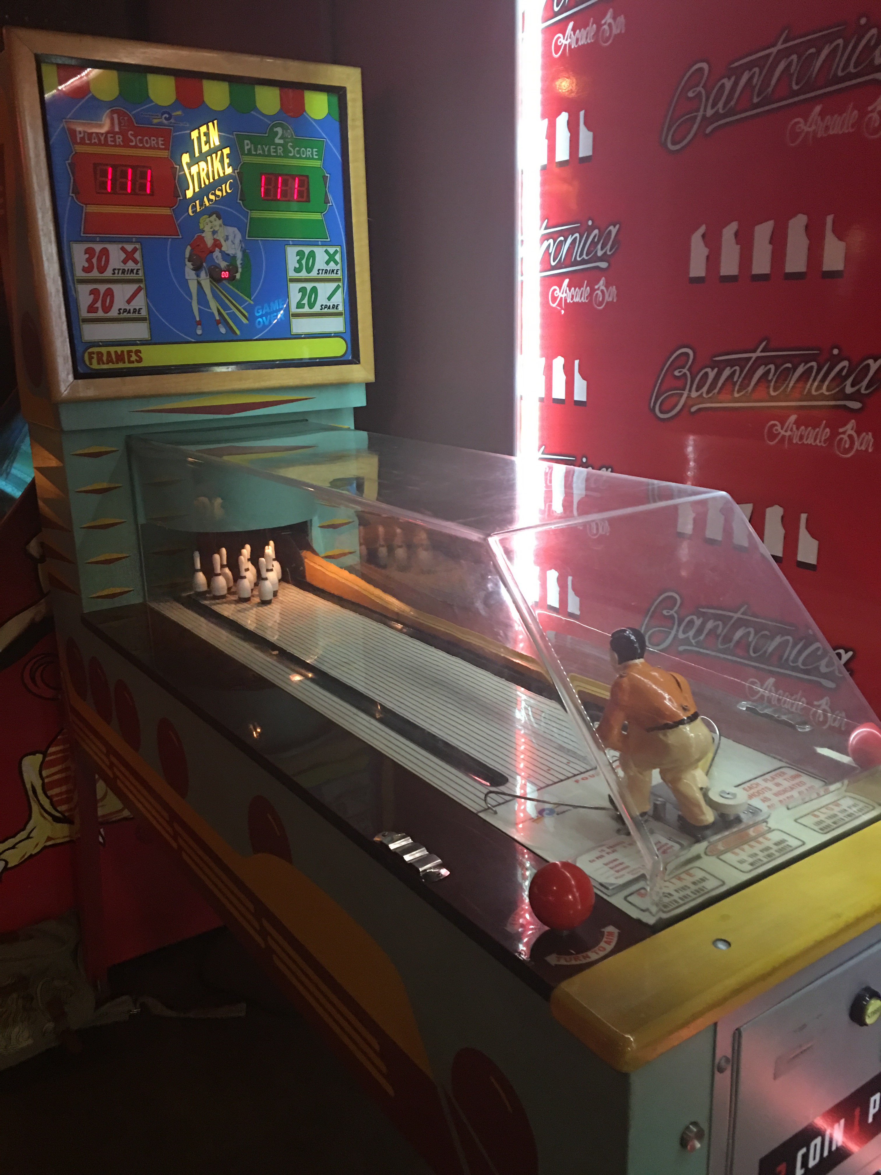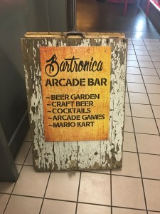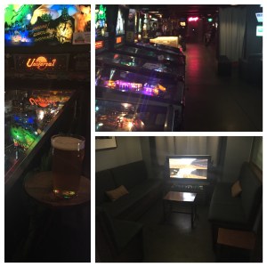 What I hadn’t seen before in a bar was the semi private booths that allowed 4 people to sit on couches and play four handed console based (?) games (don’t ask me what). Just like home, but in a bar. There was a couple of classic arcade games from the 90s like NBA challenge. I just enjoyed seeing early computer animations of the 90s Hornets, Cavaliers and Supersonics jerseys. At the front entrance was a vintage bowling game that looked beautiful.