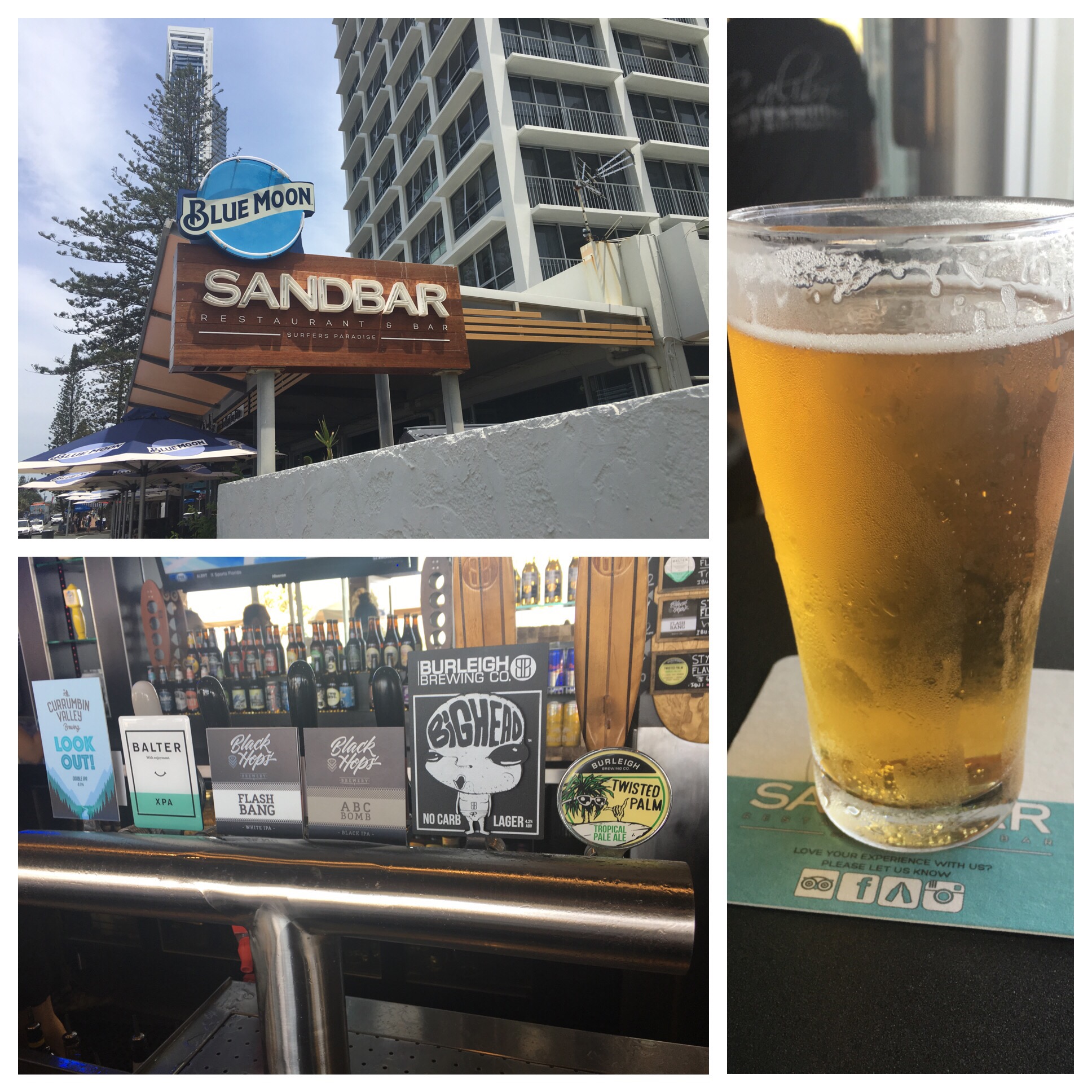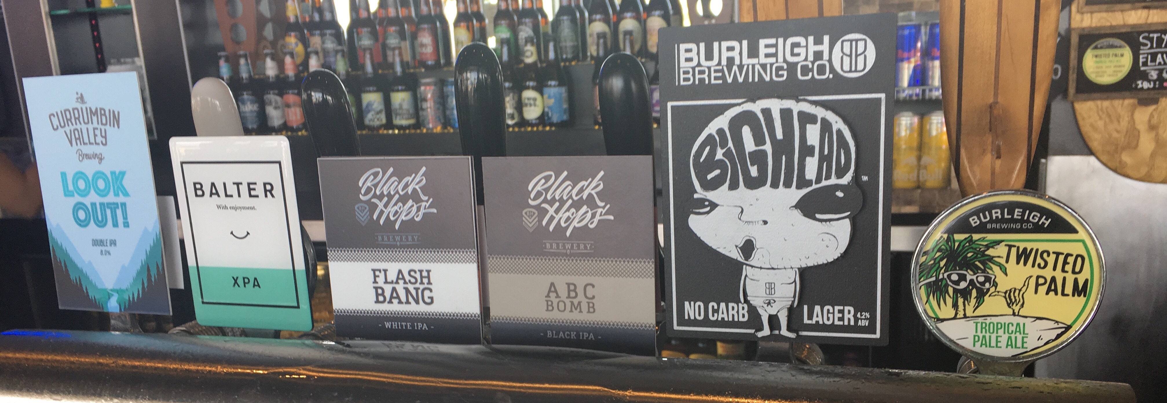 It’s a conference town and until last year I haven’t bothered hunting the craft when I’ve made the trip. Last year showed promise. This year, the Goldie has delivered. The photo above is of a tap rack at a place called Surfers Sandbar. All six beers are brewed on the Goldie and represent 4 different brewers – all from the Goldie. All up there’s 20 taps at Surfers Sandbar and the fridges are chockful of bottled and canned goodies as well from the US (Sixpoint, Victory etc) and Australia. $12 lunch specials are good value. Insane value is the 4 beer tasting paddles (“skateboards”). Each beer is a middy and today one was 4 Pines IIIPA. Amazing. This post is just an opening salvo and I hope to elaborate on some of my discoveries in later posts. This scene is developing rapidly and a brewery launched in the last month. Currumbin Valley Brewing put out their first beer last month – and it’s on tap at Sandbar. “Look Out” is a double IPA – 8% ABV. First beer a DIPA? That’s like starting a test innings with a back foot cut for 6! Bloody good beer. ABV understated.