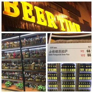 Fortuitously, on our way, I spotted a neon sign proclaiming “Beer Time”. We ducked in to very new and very well stocked bar. Beer Time’s fridges and shelves groaned under the weight of beer from everywhere, but predominant Europe. The kitchen was pumping out pizzas including one with “Golden Pomegranate Durian” topping. A crowd of Chinese blokes had gathered in their Man U jumpers to watch the FA Cup. A place that warrants further investigation.