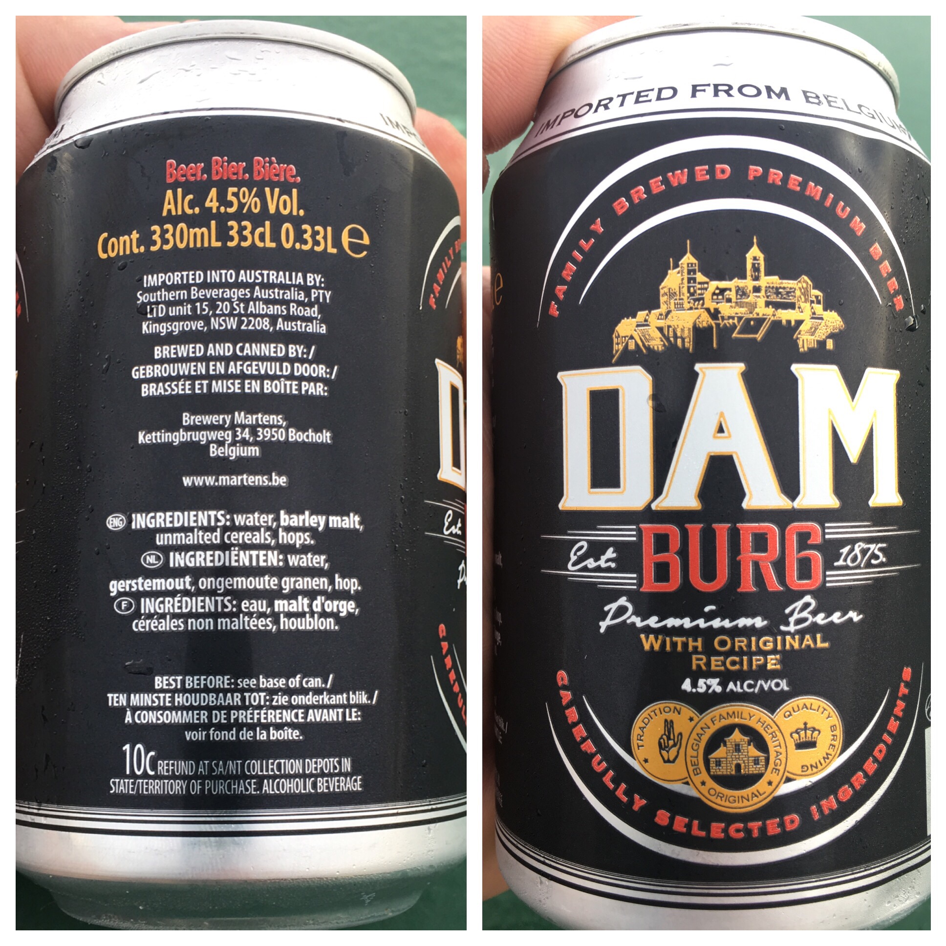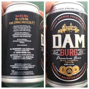 Dam Burg is brewed by Brouwerij Martens of Belgium. These guys have been around for 255 years and must brew something good, but in Oz (and at Circular Quay), we’ve only been exposed to Martens Pils. Martens Pils used to go for $10 a six pack at Mr Liquor, but was lamentable at best. Martens beer list on Untappd is looong. There are a couple of listings for “Damburger” beer, but none for Dam Burg.