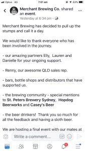 It was with some sadness that I read a message in my Facebook Feed that announced the closure of Merchant Brewing Co. Whilst the craft brewing scene is one of bonhomie and positivity, it must be bloody hard. The trajectory still seems to be north. After all, according to Craft Beer Reviewer 52 breweries have opened in 2018 and only 6 have closed. What has surprised me is three of the six that have closed, I would regard as being respected and appeared successful.
