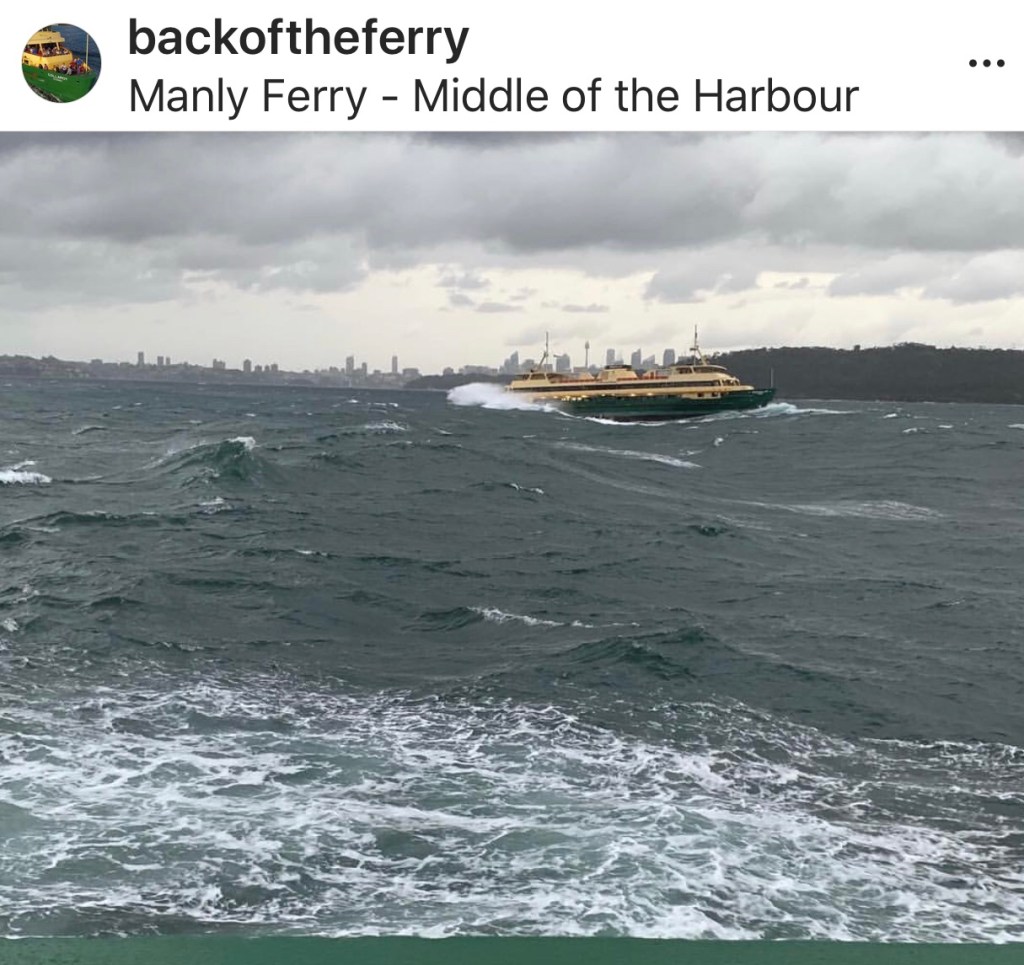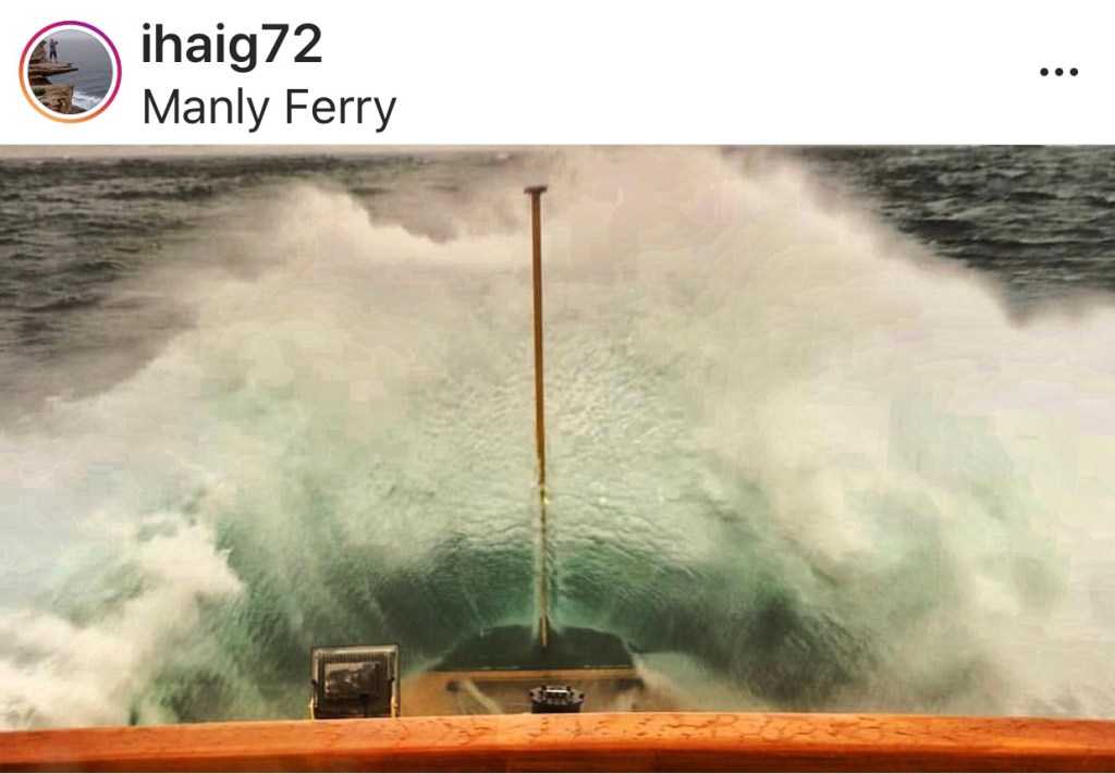 Whilst I missed the worst of the rain and wind, I was able to enjoy one the best white knuckle rides on the Back of the Ferry. Waves were breaking in the gulf between North and South Head and there seemed to be swell in all directions. Our skipper took us a long way out before executing a masterful left hand turn to enable us to surf into Manly. Troughs were overhead, but the Ferry handled them brilliantly. We also managed the swell well not spilling a drop. Truly the World’s Best Commute.
