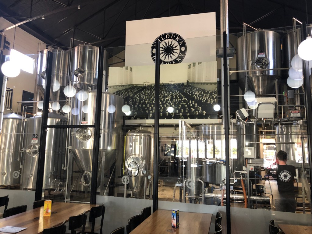 Time was of the essence once we eventually arrived in Mildura, but my daughters humoured me by permitting the briefest of visits to the Mildura Brewery Pub. What a space. Housed in the old Astor Theatre, gleaming brew tanks dominate the back of the building. There is still plenty of room for long wooden tables and an expansive bar and kitchen. We were in early and didn’t eat, but the menu looked good and affordable.