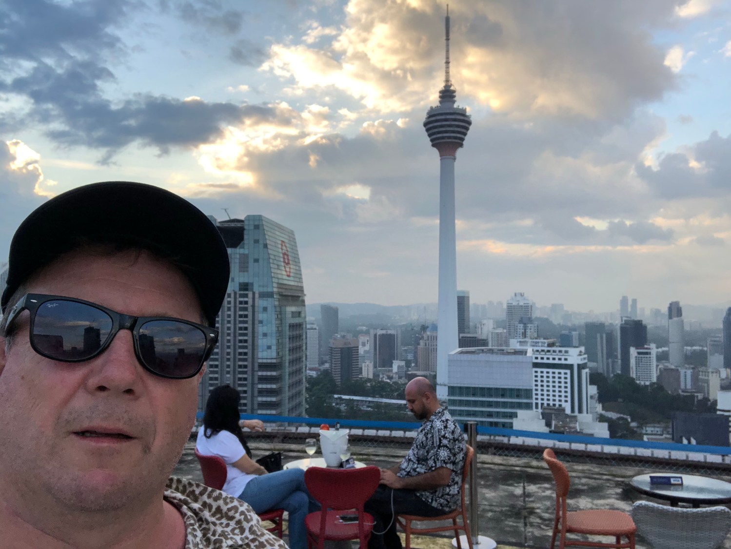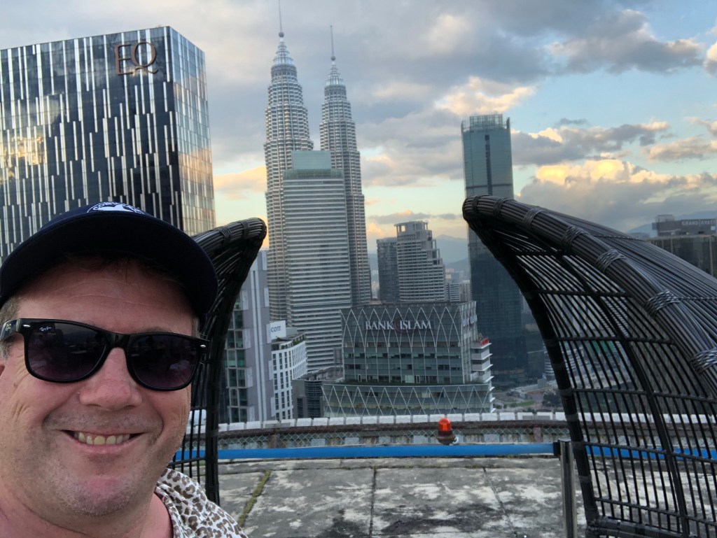 Four flights of stairs later – wow. A cool breeze and an amazing 360 degree view. All punters get the same perspective even though everything is reserved on the outside. Petronas Towers and all the other towers. It is a really chilled place. Dress code heats up at 9pm, but I reckon at 6pm there would be few better places in KL to have a beer.