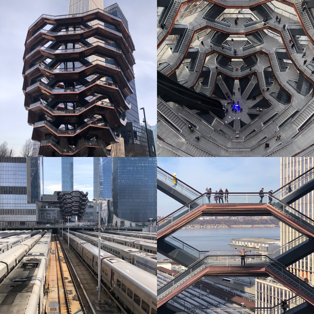 The High Line ends at Hudson Yards, which used to be centred around a rail yard, but is now the site of a huge urban development with new skyscrapers, residential towers and railway stations being built. On of the developments is a USD$200m extravagance called the Vessel. It is a 16 stories of interlinking staircases and platforms. Great views and good fun.