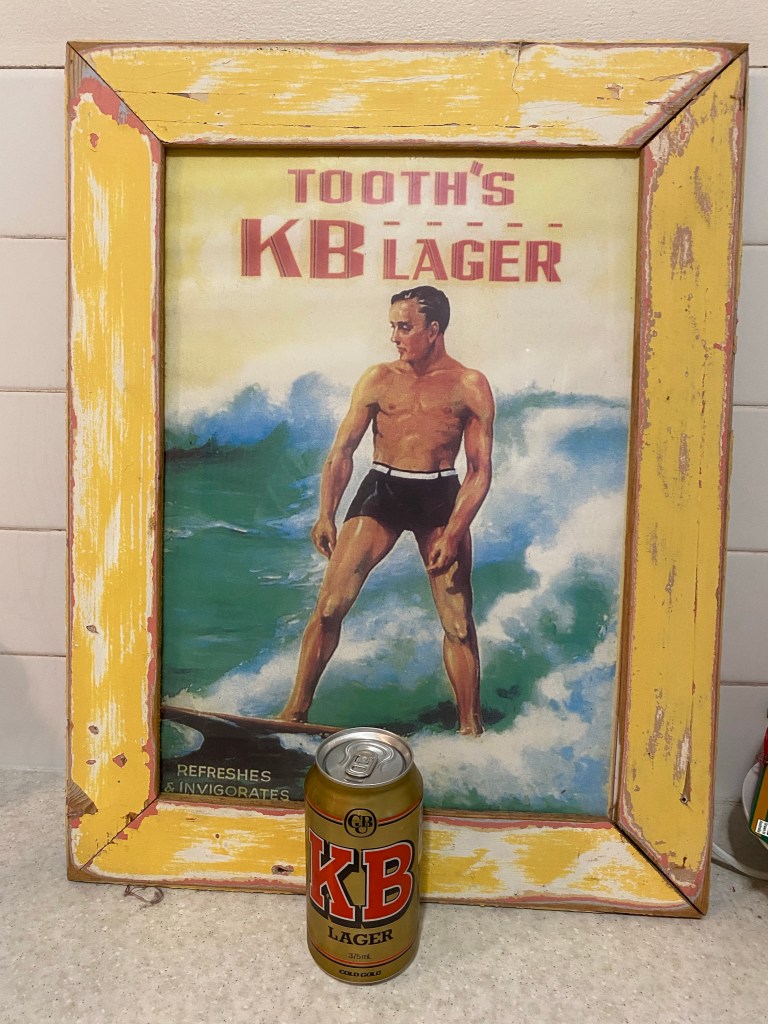 KB Lager was manufactured at the Kent Brewery, which was on Broadway in Central Sydney. John Tooth, the founder of Tooth & Co named his brewery after the English county from which he came. The Tooth horse logo is the symbol of Kent. It was often referred to as Kid’s Beer because it was sweet and very easy to drink. I reckon some KB merch would go like the proverbial. Two designs. The iconic poster below (which I happen to have) or the beer label on a plain white shirt.