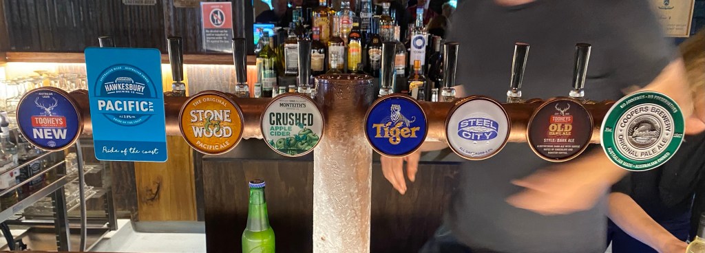 There’s a couple of new beers to the Tavern line-up with Steel City All Day Lager and Hawkesbury Pacific Ale joining the old perennials – New, Old and Coopers Pale. The Dr Jurd’s Jungle Juice window has survived and the good Doctor’s ashes remained interred in the pillar. The Toohey’s New blue walls have been updated with a neutral sand colour. Much less garish, but the white line that marked the Great Flood of 2007 has gone.