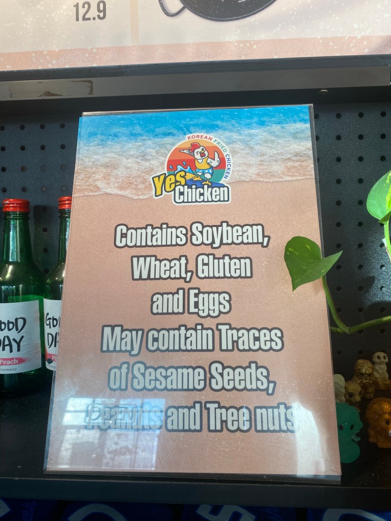 I reckon Yes Chicken has staying power even if they appear less than sympathetic to those with food allergies or vegan or vegetarian preferences. I don’t think I’ve seen a sign in a restaurant that is more upfront about the presence of wheat, gluten, eggs, nuts etc in their food. Well, at least you know where you stand.
