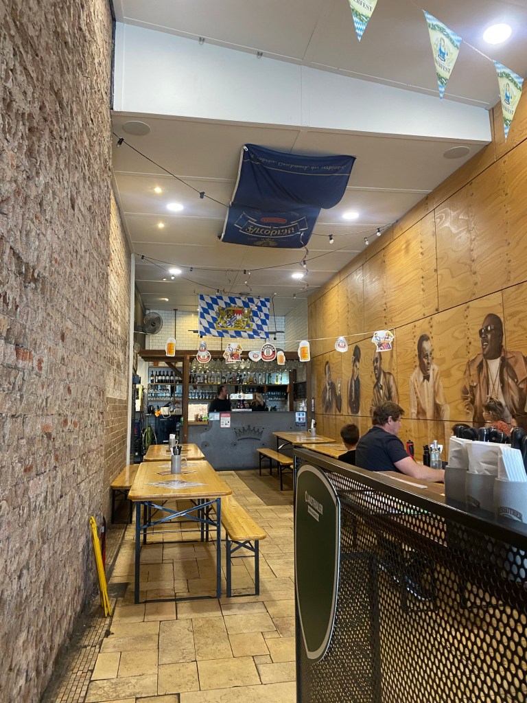 I arrived too early for the gig and sought sustenance after a long public transport commute. It was slim pickings until I spotted the unlikely Mia’s German Beerhall. What a venue. It is a narrow but deep room with simple long tables and benches (like a Beerhall).