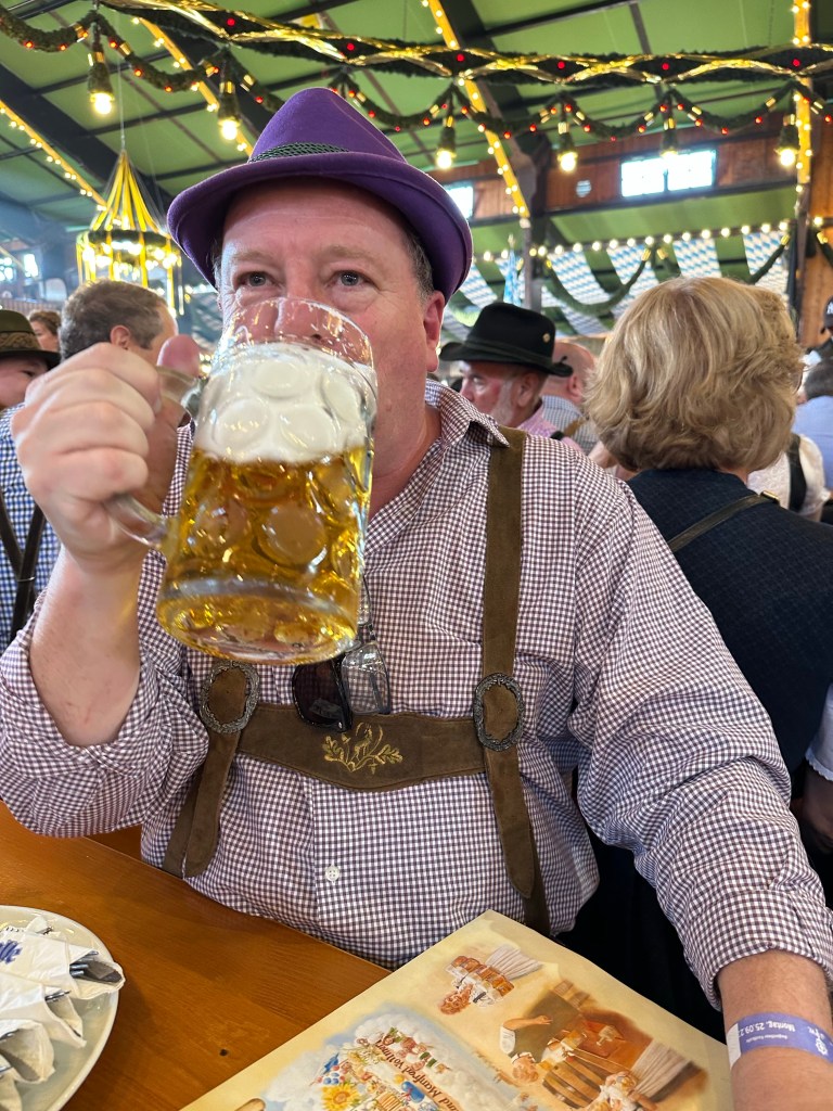 I was very lucky to be attend as a client of a German company. I attended meetings in their offices during the day and whilst I was worried about a stitch up, my hosts were also wearing their leiderhosen and checked shirts. One bloke told me that he was attending 8 OktoberFest sessions – some work, some play. And he left nothing in the tank on the night I attended – very impressive.