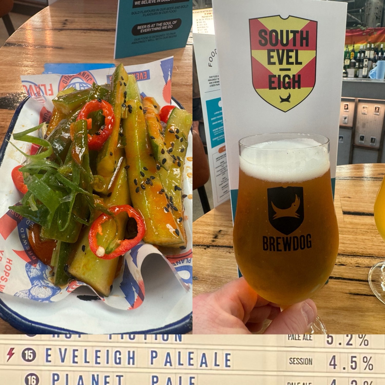The food menu is robust with the usual burgers, wings and pizzas and a couple of oddities including a cucumber salad. Well, I thought it was an oddity – something only in Asian restaurants (and which I always order). According to my socially-media aware daughter the smashed cucumber salad is a tik-tok rage and causing cucumber shortages. Brewdog’s take is to slice the cucumber into batons not smash it, but it is a fine example of the dish and a pleasant surprise.