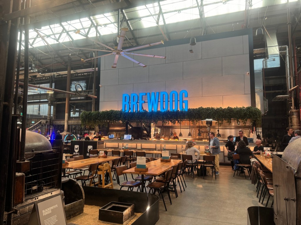 The space meets the criteria for Brewdog venues – vast. Both inside and outside. The good citizens of South Eveleigh with young children have embraced the outside space. A riot of roaming pastel Rugrats surrounded parents sipping contentedly on their various beverages. At least taps serve up mainly Brewdog beers with a smattering of guest taps (Wayward, Moondog, Slow Lane and Fontaine). Brewdog classics like 5am Saint, Punk XPA, Elvis Juice sit along alongside unique brews like Eveleigh Pale Ale.
