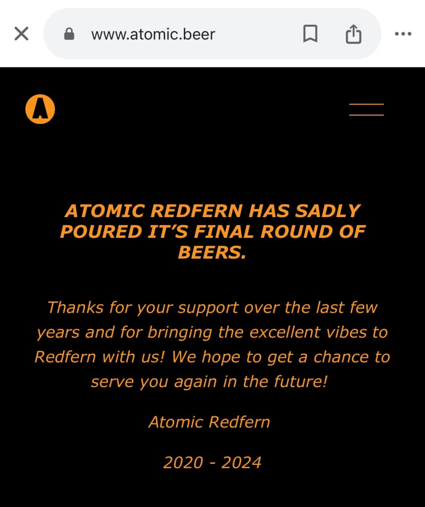 So best to remember the good times of Atomic. They made really good beer, in my humble opinion. The Atomic brand preceded the Redfern venue. #2 had an Atomic Pale Ale on his back deck in 2012, and we knocked off a few on the Back of the Ferry. Their trivia night on a Monday was always good value. Valé Atomic.
