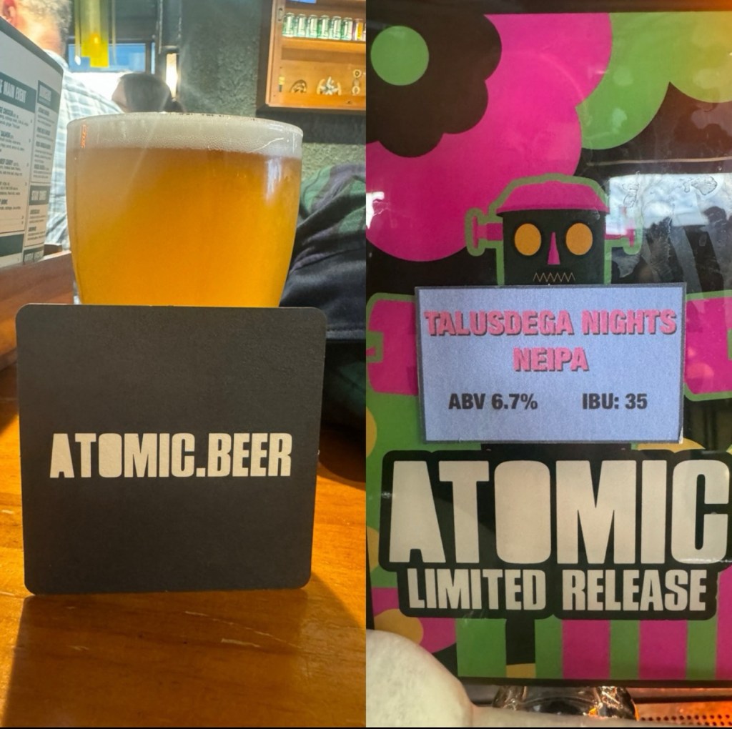 After my visit to Brewdog, Saturday week ago, I paid a quick visit to Atomic Beer Project. I’ve been a few times over the years, and it is a particular favourite of daughter number #3 (also known as inductee #103). Little did I know that a schooner of Talusdega Nights NEIPA would be my last beer at Atomic.