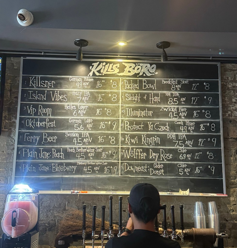 Kills Boro Brewing is a 1.4km walk from the ferry terminal. It is a fantastic little spot serving great food and beer. New York City is not a cheap place. It is best to try and ignore the impact of taxes, tips and the exchange rate on just about every purchase (multiply by 1.08 for tax, 1.2 for tipping and 1.5 for the exchange rate). I’d visited a very schmick taproom – Talea Beer Co Bryant Park – where USD10 got you a 9oz glass of admittedly tasty IPA – but that’s almost AUD20! Well Kills Boro does a much better deal with a good old US 16oz glass of Pilsner setting you back USD8 or a 7.5%ABV IPA is USD9.