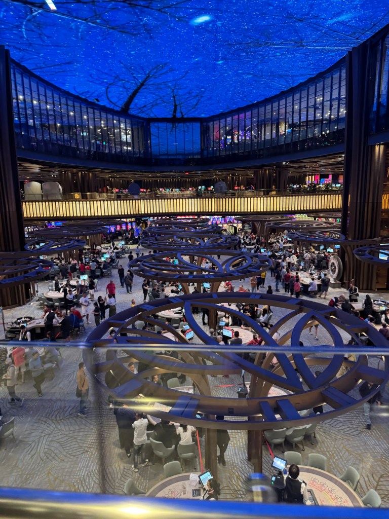 There is a large casino on two levels that would be the cash cow. Photos aren’t great because they are forbidden. There are an extraordinary number of slot machines with that little Aussie Battler, Aristocrat, prominent. There’s tables with croupiers doing blackjack and roulette, but there’s also almost like classrooms, where players sit in front of a digital screen and a single croupier.