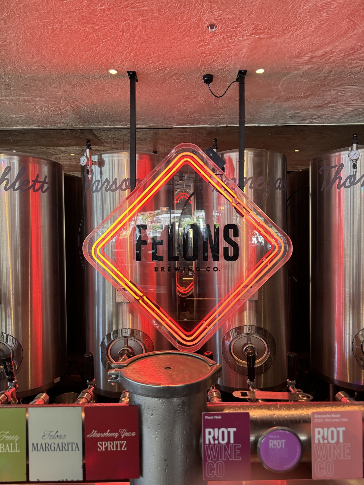 In addition to the tap beer are a number of tap cocktails and seltzers. it is an el primo location and the Felons crew would have paid top dollar, so they need to make an earn, but the prices are steep. On a Sunday, I paid $20.50 for a pint of 6.8% IPA. Yep – Sunday surcharge, but still – might be a Manly record.
