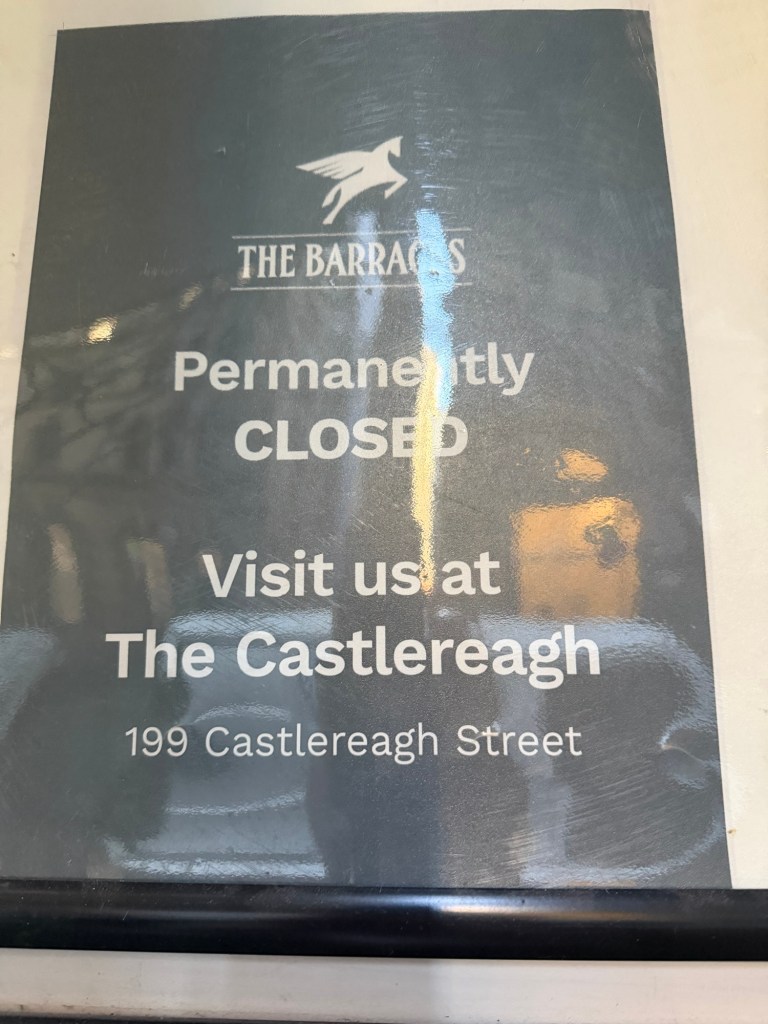 I had two eras of patronising the Combined Services RSL, which ended its days as Barracks – but it’ll always be the Combined to me. Sadly, the Combined is no longer. I thought I’d sneak in for a nostalgic schooner before dinner with old mates – but was confronted by the laminated sign above. Nooooo – say it ain’t so. Permanently closed and merging with the Castlereagh Club near the corner of Park and Castlereagh.