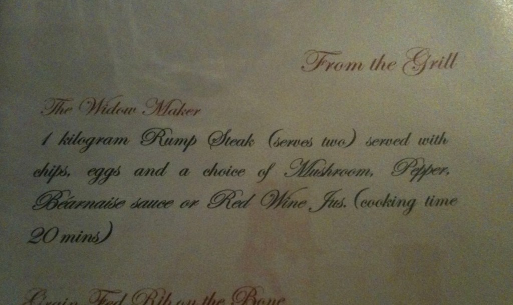 The menu was old school. The “From the Grill” was my go-to section, but I never did take on the Widow Maker. I was working on a particularly difficult project with a demanding (aka bunch of pr1cks) steering committee and after the monthly Steering Committee myself, the Programme Director and my 2IC would retire to the Combined Dining Room to draft the minutes and bitch and moan about most members of that Stereing Committee meeting. It was a long project so we dined there often, so much so that the Combined was often referred to as The Spiritual Home of the product we ultimately delivered.